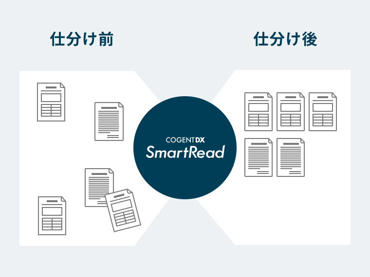 次世代型のAI OCRであるSmartReadでは、文書の仕分け機能が標準機能として備わっています。発注書や申込書、アンケートなどフォーマットが定まっている文書の場合、事前にフォーマットを登録しておくことで、複数のタイプの文書をまとめてアップロードしてもSmartReadが1枚ずつ自動で判別し仕分けるため、事前に人の手で文書を分類する時間を削減できます。