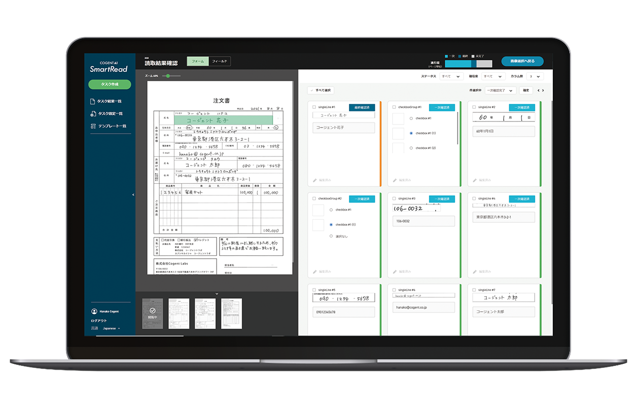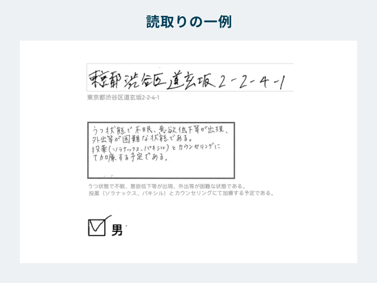 ディープラーニングを使用した独自開発のAIアルゴリズムを活用し、手書き・活字を問わず、ひらがな、カタカナ、漢字、数字、アルファベット、記号、印刷でかすれた文字など、様々なタイプの文字を非常に高い精度で読み取り、デジタルデータとして情報を抽出することができます。