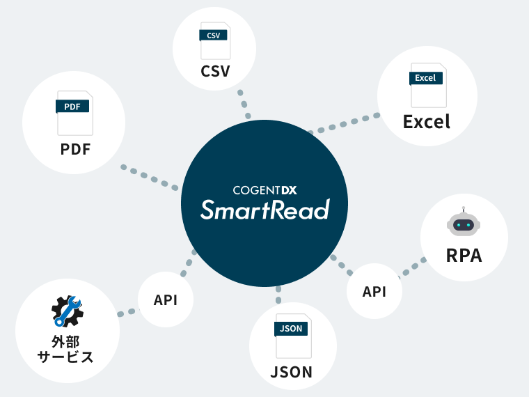 読み取った情報をCSVやExcel等の形式でデータ出力できる他、APIを活用して基幹システムやRPA、外部サービス等との連携も可能。例えばRPAのロボットからSmartReadを呼び出し、文書ファイルの収集から認識結果の出力、業務システムへのデータ入力までを自動化できるため、一連の業務の効率化に貢献します。