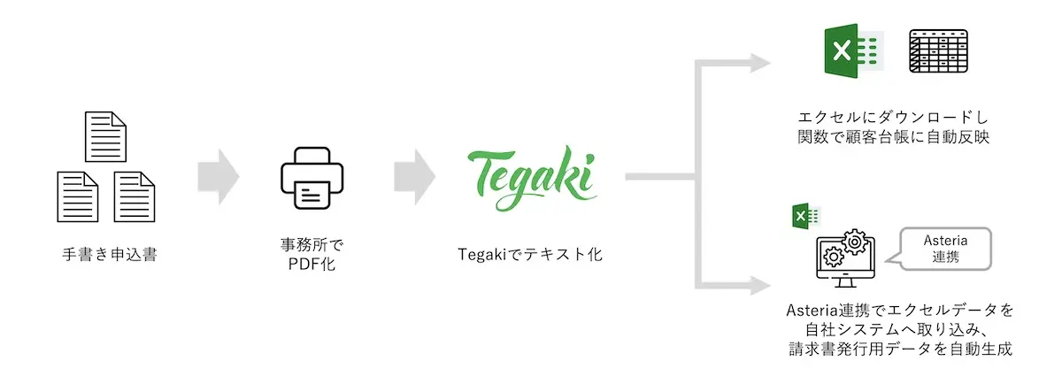 田村氏:上記のようなフローで行っています。Tegakiでの読み取り結果をExcelに抽出した後は、Excelの最終シートに値貼付けすると関数で自動で台帳に自動反映されるようになっています。その後は、Asteriaを通じて自社システムにデータを連携し、請求書発行用データを自動生成するという流れです。